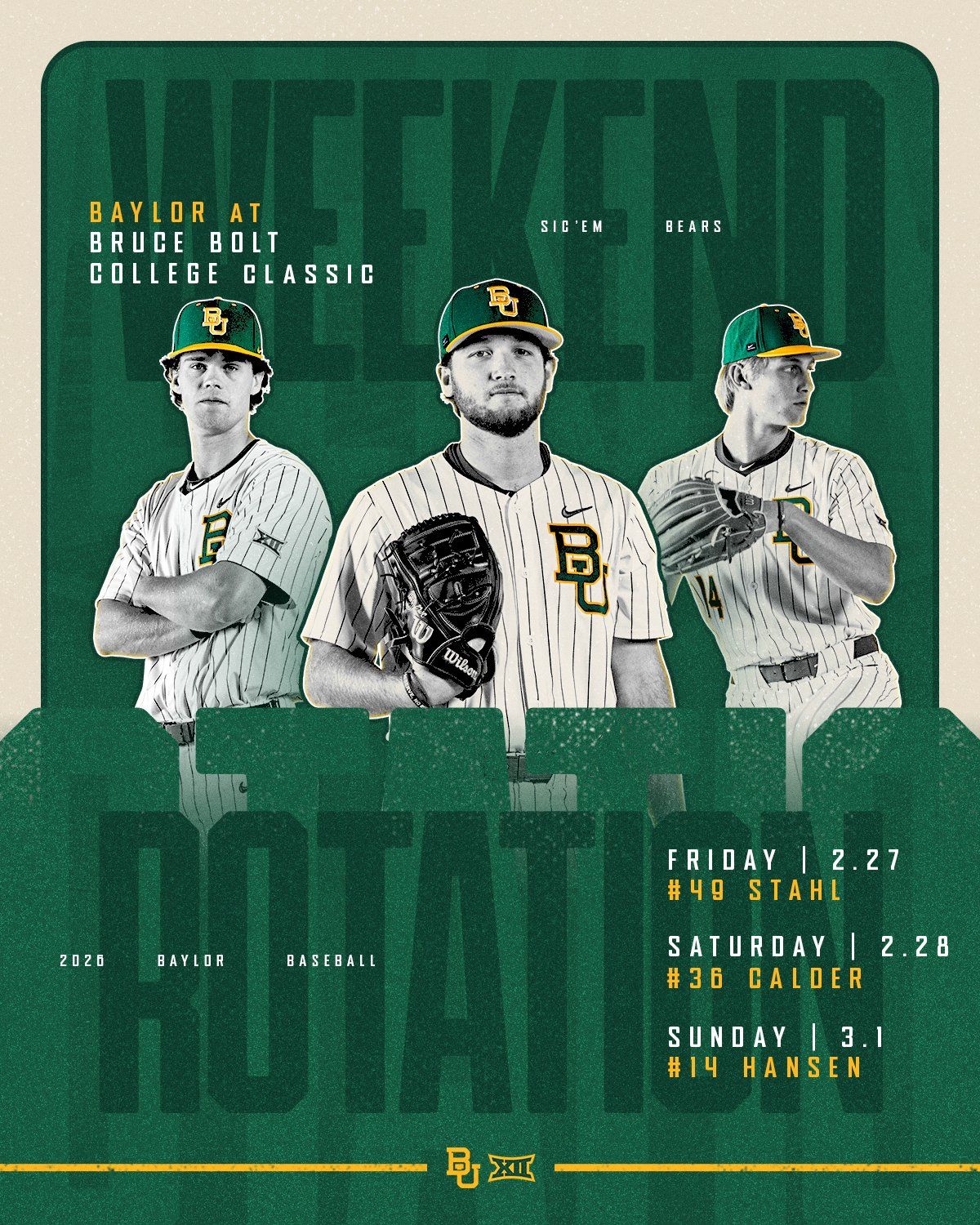 🔼 Houston Hustle. Baylor baseball is spending the weekend at Daikin Park in Houston for the 2026 Bruce Bolt College Classic. They’ll open the weekend today at 3:05 p.m. against No. 11 Ole Miss. Tomorrow, the Bears will face No. 3 Texas at 7:05 p.m. The weekend will conclude on Sunday at 6:05 p.m. against No. 23 UTSA.