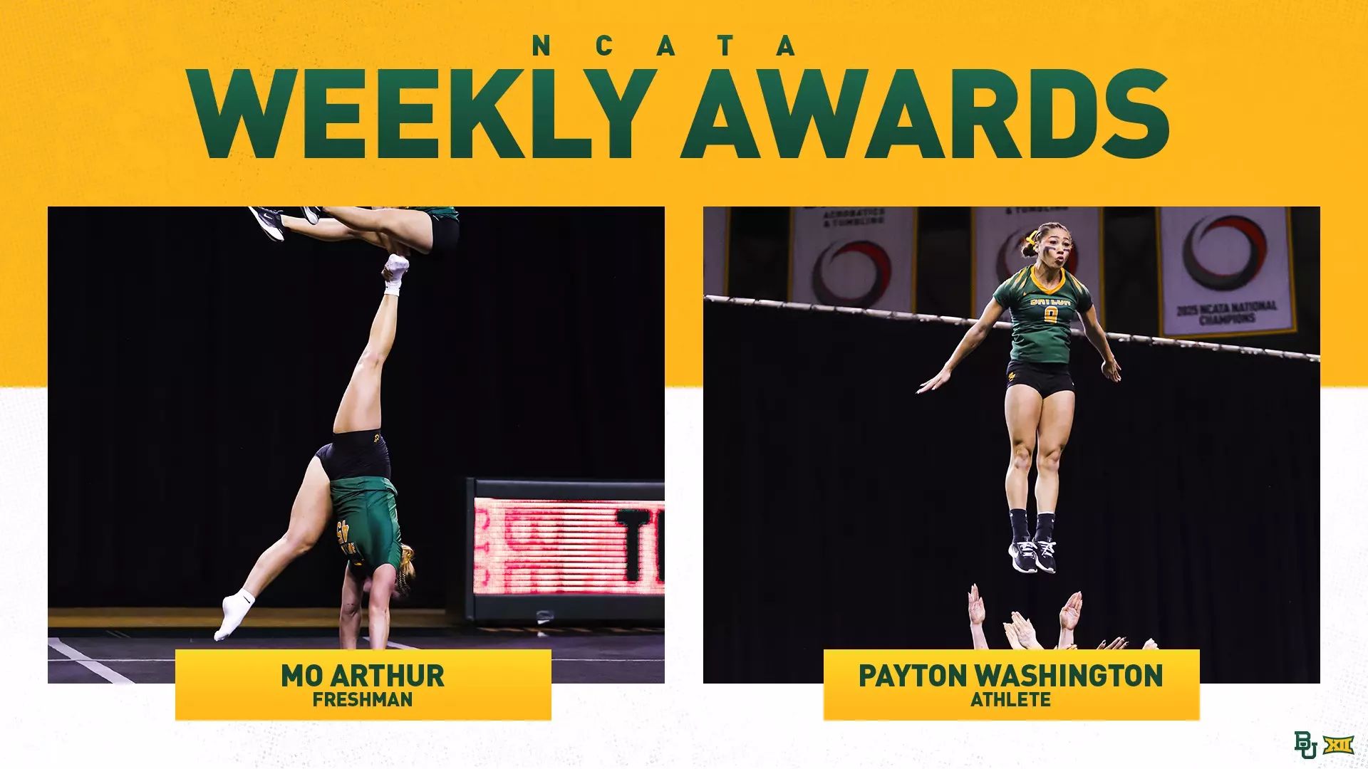 🔼 Streak Continues. Baylor A&T continues to dominate NCATA weekly awards! Mo Arthur earned her fifth consecutive Freshman of the Week honor, highlighted by two perfect 10.0 scores. Payton Washington claimed her 10th Athlete of the Week honor, leading Baylor to seven scores of 9.50 or higher. Leavy McDonald earned honorable mention for Specialist of the Week, delivering a powerful performance, particularly in pyramid events.
