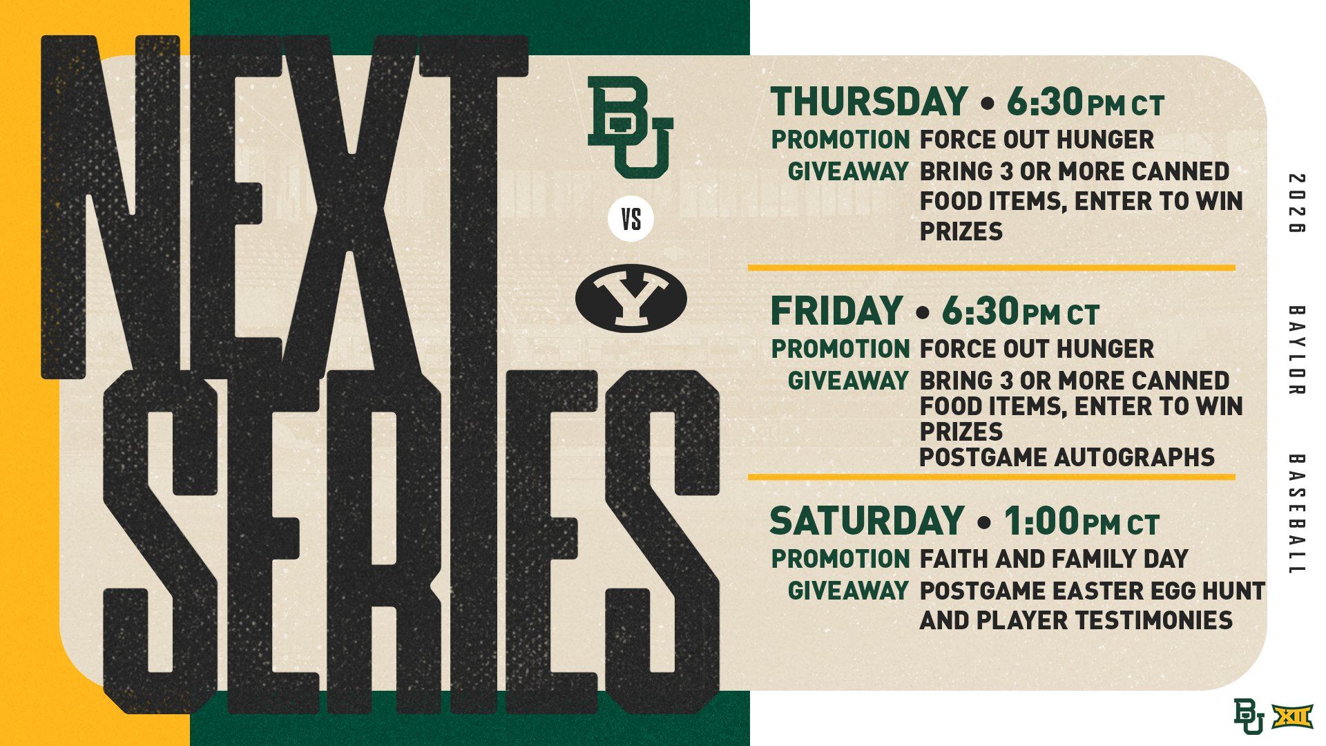 🔼 Force Out Hunger. Baylor baseball hosts BYU tonight through Saturday for a three-game Big 12 series. First pitch is set for 6:30 p.m. Donate a minimum of three canned food items to be entered to win a prize! Saturday’s game is Faith & Family Day, featuring a postgame Easter Egg Hunt.