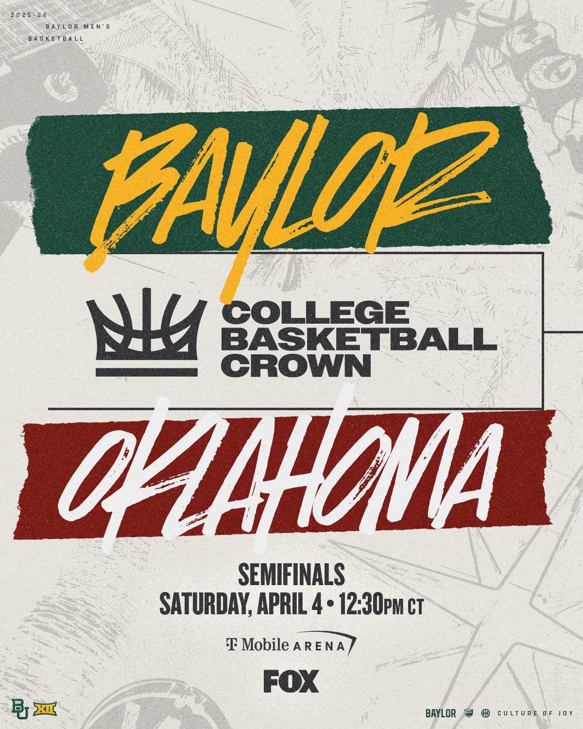 🔼 Semi Saturday. An old Big 12 matchup is on the horizon! Baylor men’s basketball will take on Oklahoma tomorrow at 12:30 p.m. in the College Basketball Crown semifinals. The game will be broadcast on FOX.