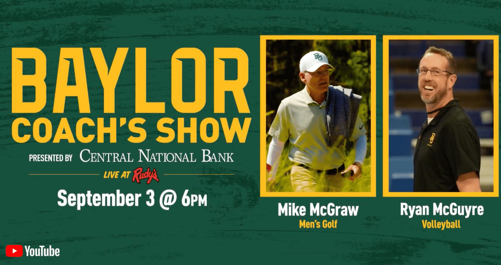 Join us at Rudy’s tonight at 6 p.m. for the Baylor Coach’s Show! Hear from men’s golf coach Mike McGraw and volleyball coach Ryan McGuyre. Fans at home can watch live on YouTube.